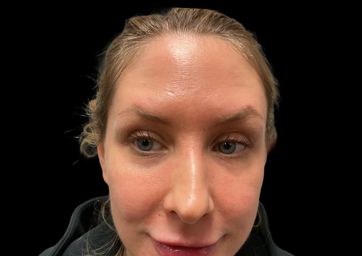 Description: This patient receives neuromodulator treatments to soften the horizontal expression lines on her forehead, which are caused by the repeated contraction of the frontalis muscle. The product is strategically placed to temporarily relax this muscle, preventing the strong upward pull that creases the overlying skin. The result is a smoother, more refreshed appearance that also helps prevent these dynamic lines from becoming permanently etched into the skin over time.