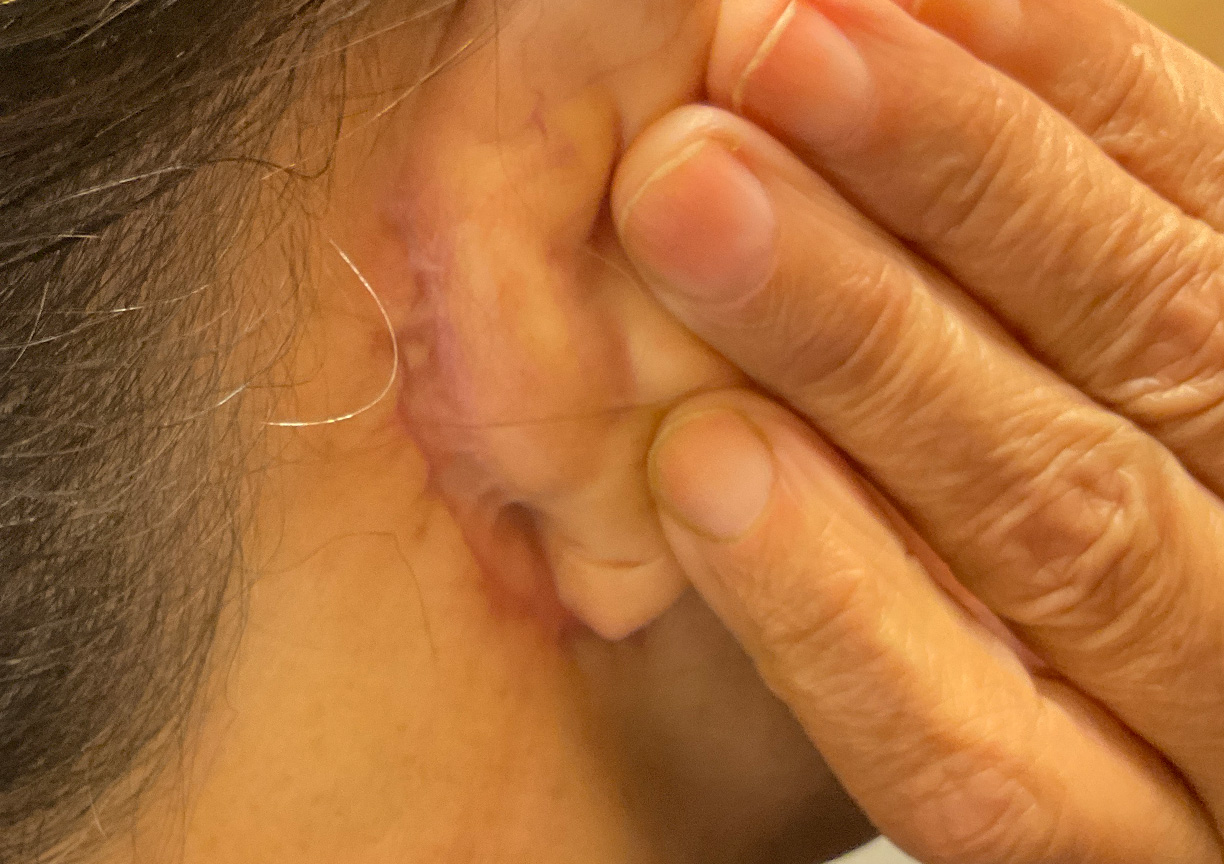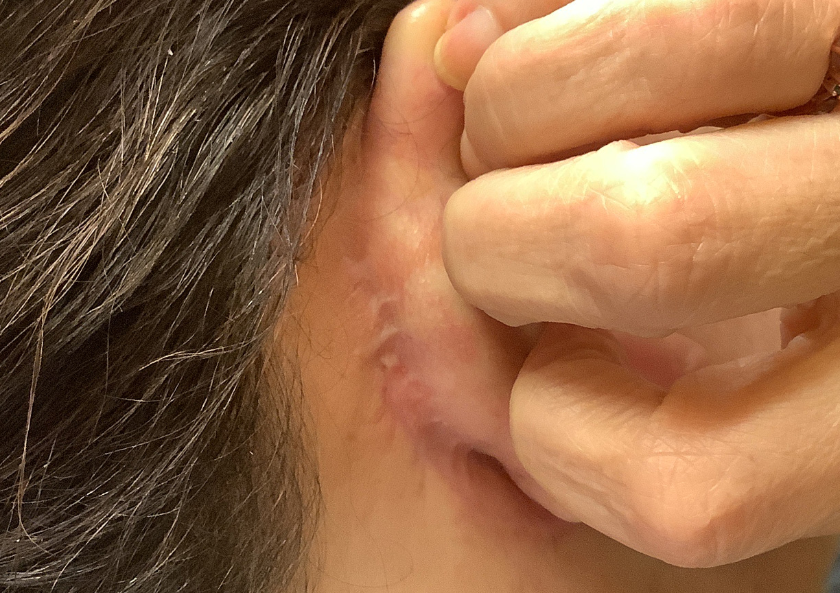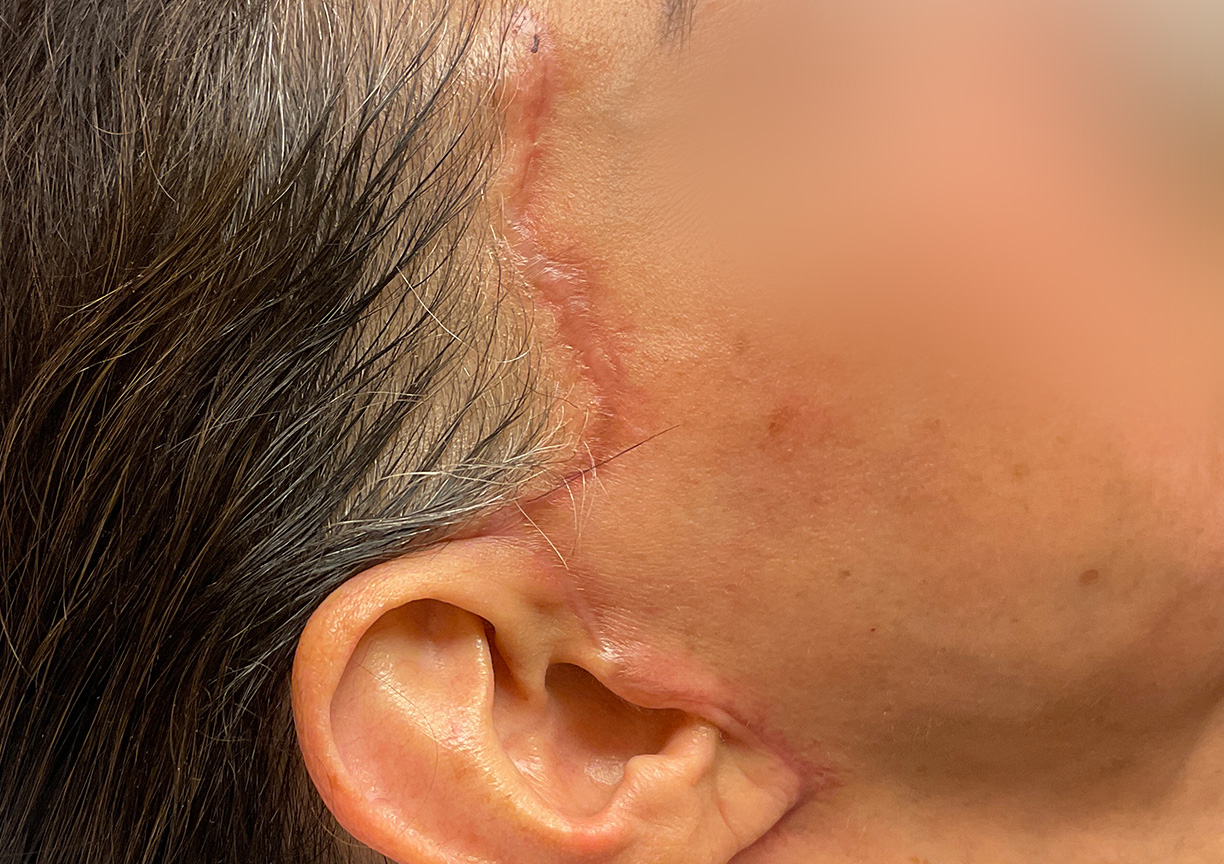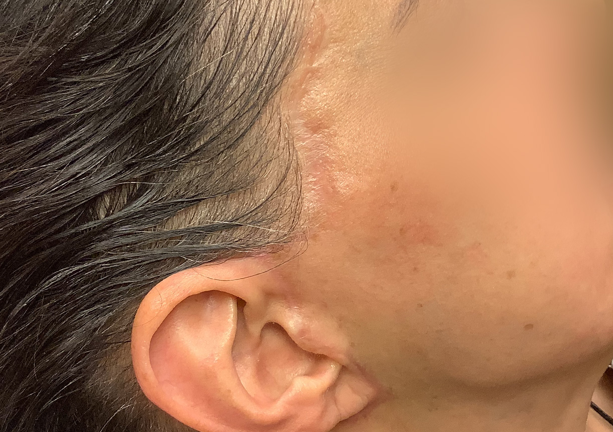 Description: After being dissatisfied with the visibility of the scarring from a previous temporal brow lift, this patient underwent a series of three targeted laser scar treatment sessions to refine the incision line. The laser energy works by remodeling the rigid scar tissue and stimulating fresh collagen production, effectively smoothing the texture and reducing discoloration to blend the mark with the surrounding skin. We are already observing significant improvement, demonstrating how a consistent laser protocol can successfully minimize visible scarring and improve final surgical aesthetics.